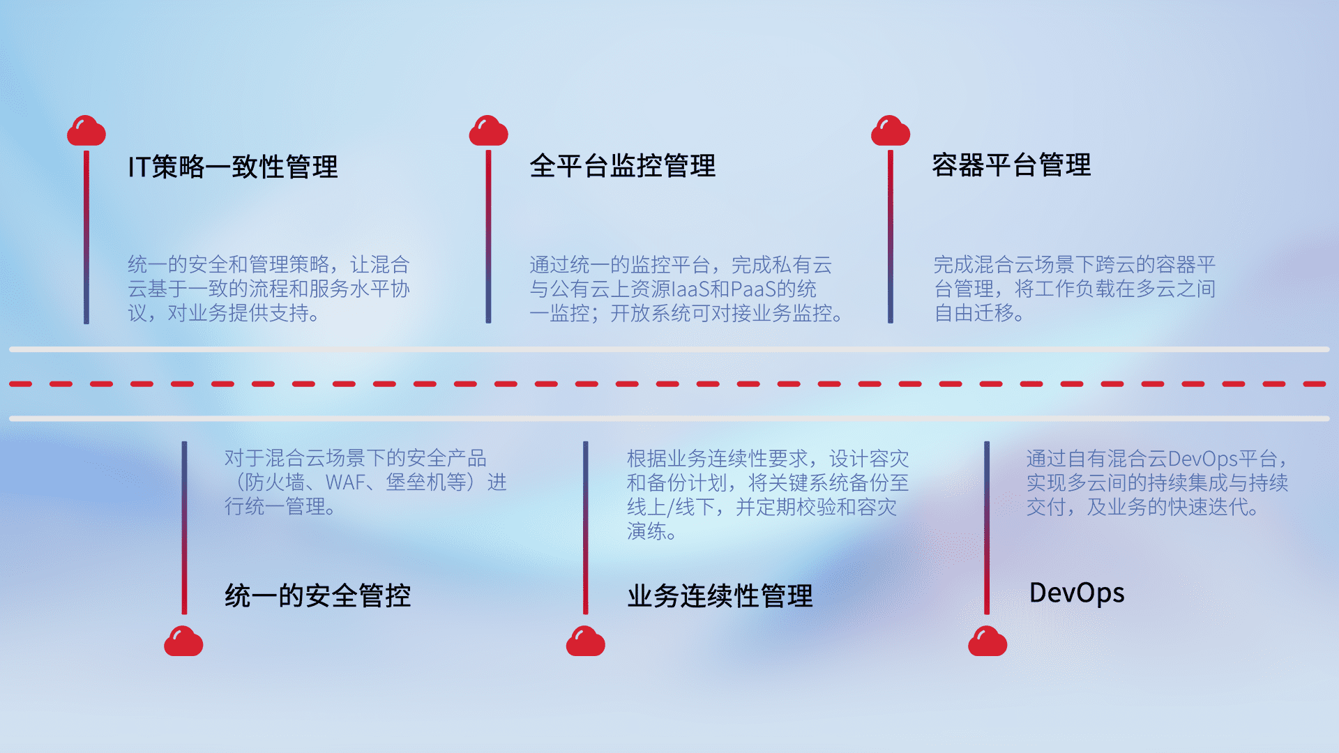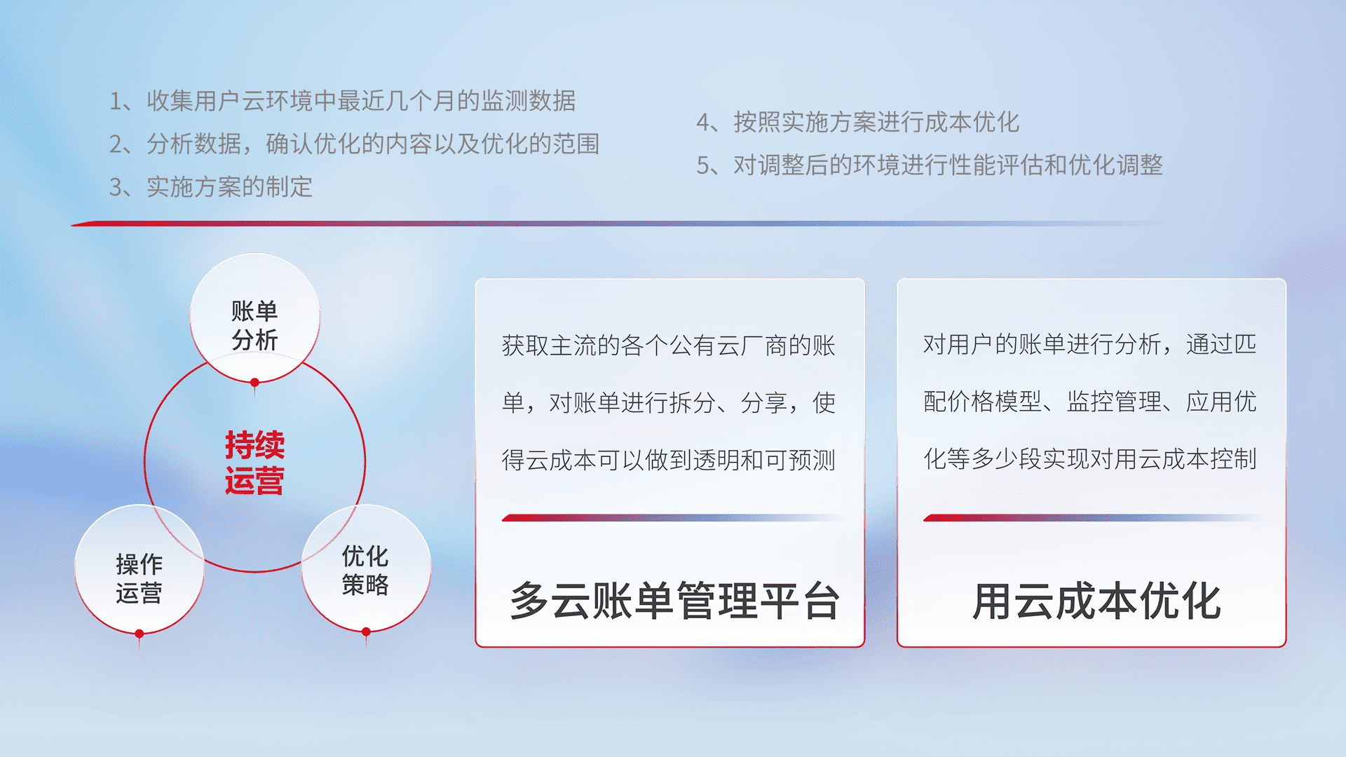 通过多云纳管,,,以统一的资源数据模型把客户的云资源进行抽象和封装,,进而实现对多云资源的统一操作,,保障云资源管理的可靠性、、稳定性与可用性。。。。量身定制化运维内容,,,,配置、、、、开发运维、、、补丁管理、、、、备份、、、监控、、、、认证和访问管理、、审计和日常巡检等,,保障在用云过程中的可靠度,,,稳定度以及高可用率。。。。