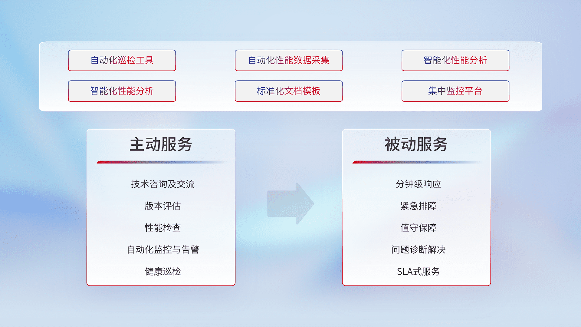 智能化工具和标准化文档,,保障服务质量,,,,提供主动服务(包含技术咨询、、版本评估、、、性能检查、、、自动化监控与告警、、健康巡检)和被动服务包含(分钟级响应、、紧急排障、、、、值守保障、、问题诊断解决、、、、SLA服务)。。。